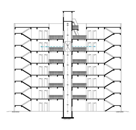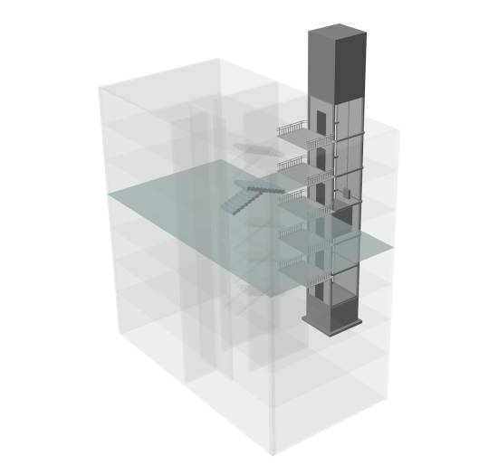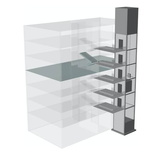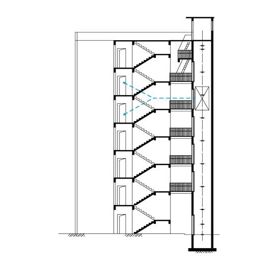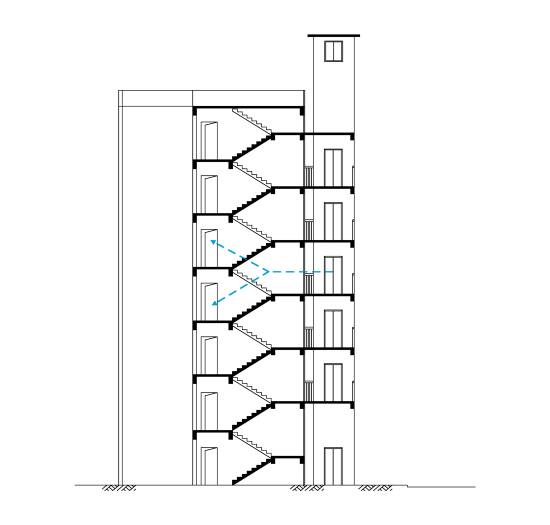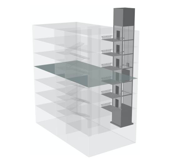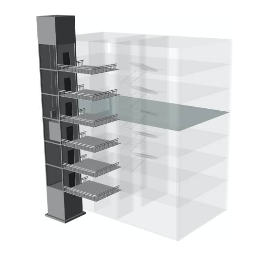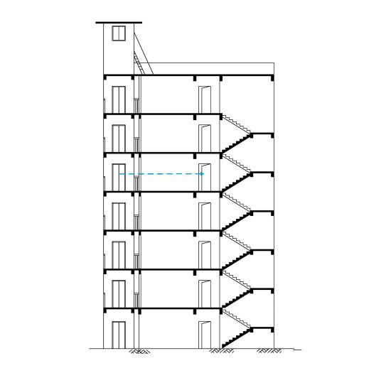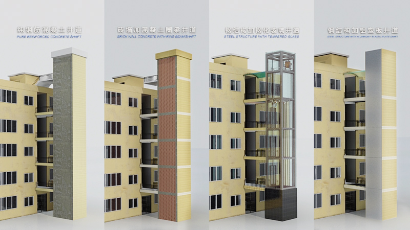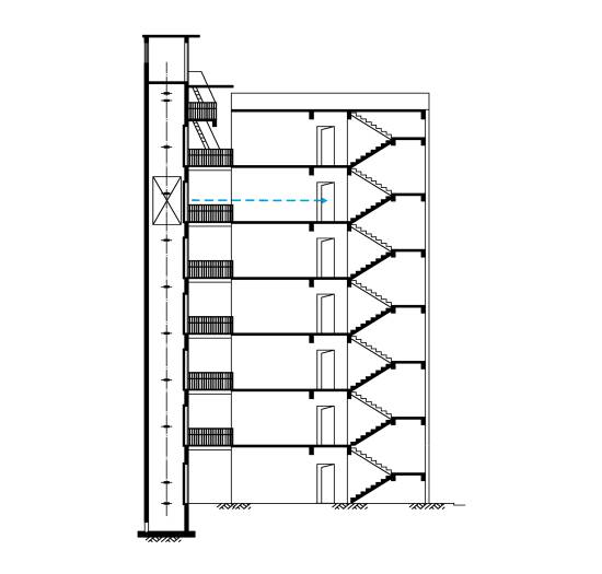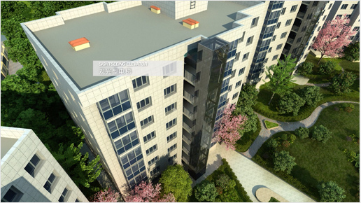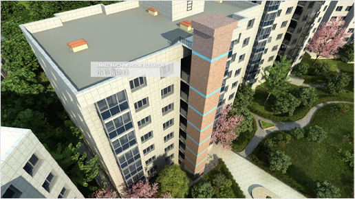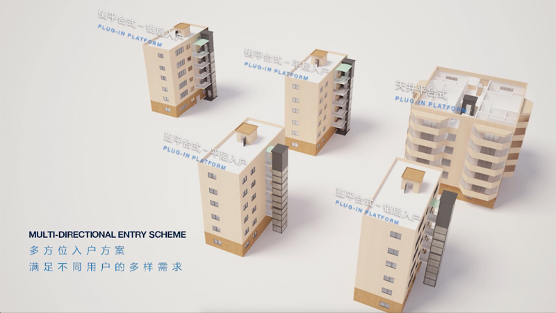 平层入户是指电梯出入口位于楼梯平面,实现乘坐电梯直达指定楼层。直平台式(平层入户)可从住宅楼正面实现入户,要求建筑物的正面空间足够宽广,加装电梯后进出楼梯的距离满足相关安全走火通道等要求。