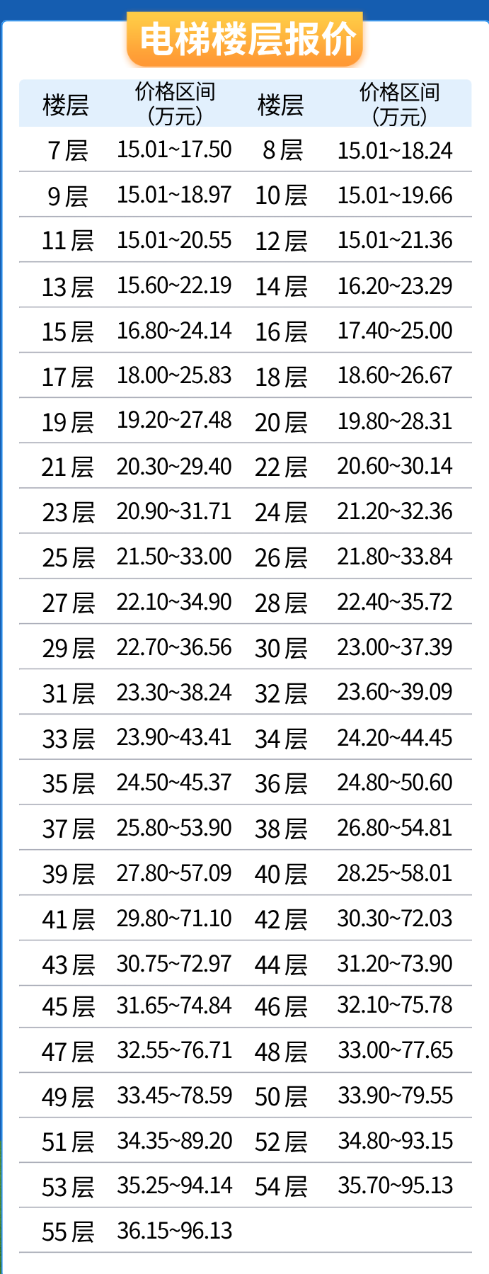 根据官方给到的电梯楼层报价◈✿✿◈,7层最低15万元左右◈✿✿◈,楼层越高◈✿✿◈,价格越高◈✿✿◈,30层小区的1部电梯费用在23-37万元不等◈✿✿◈;55层电梯最贵◈✿✿◈,高达近百万元◈✿✿◈。