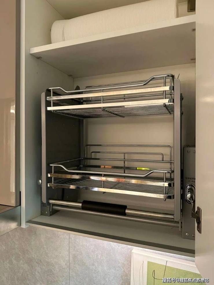 橱柜作为强功能性的收纳系统ღ◈★,自然少不了操作性能上的考究ღ◈★,吊柜做了升降式的拉篮ღ◈★,以后再也不用爬上高凳拿取了ღ◈★。